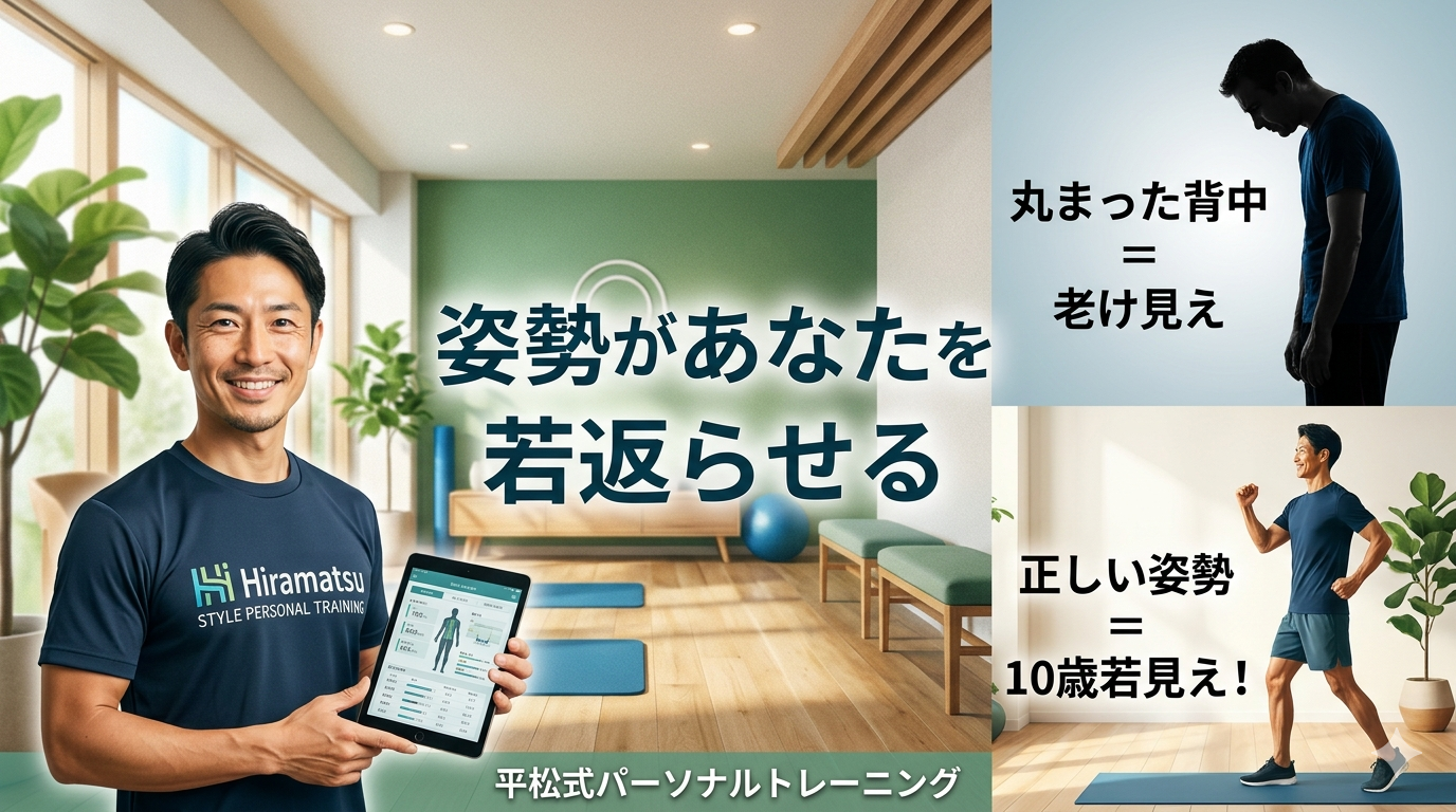 必死にトレーニングをして適正体重を保ち、筋肉をつけたとしても、背中が丸まっているだけで実年齢より老けて見えてしまいます。 せっかくの努力が、「見た目の美しさ」や「若々しさ」に結びついていないのは、非常にもったいないことです。